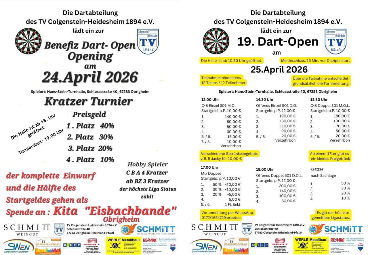 Benefiz Dart-Open - Opening am 24.04.2026 - Einlass ab 18.00 Uhr - Turnierbeginn um 19.00 Uhr